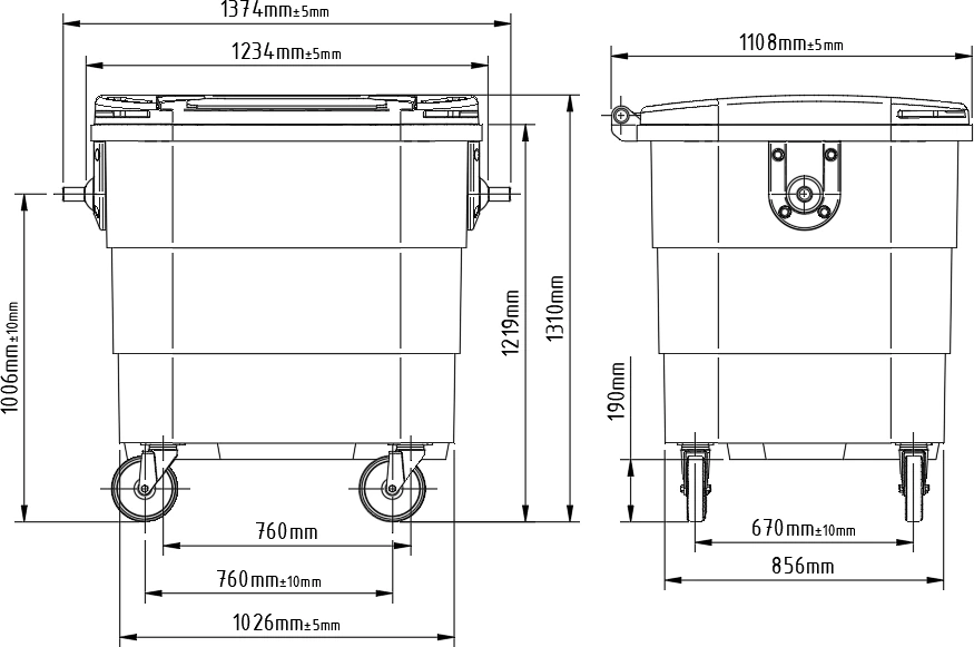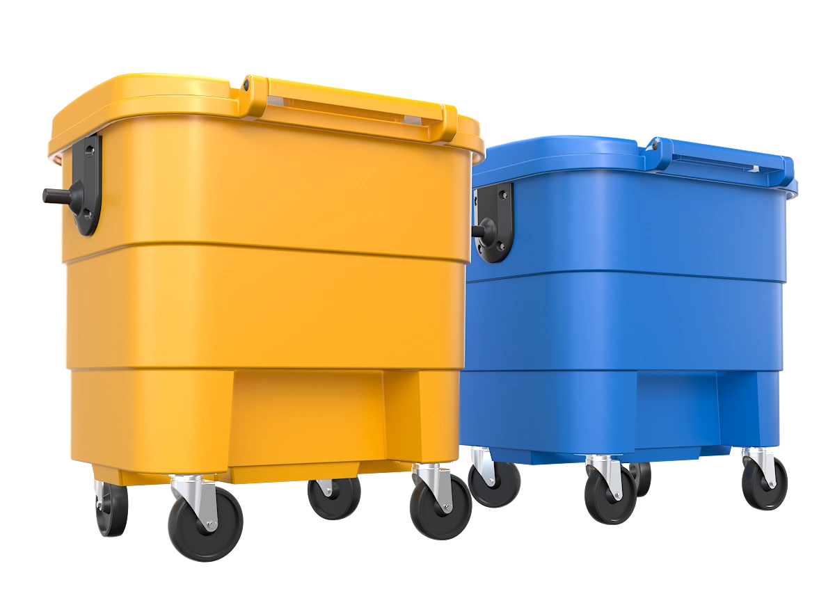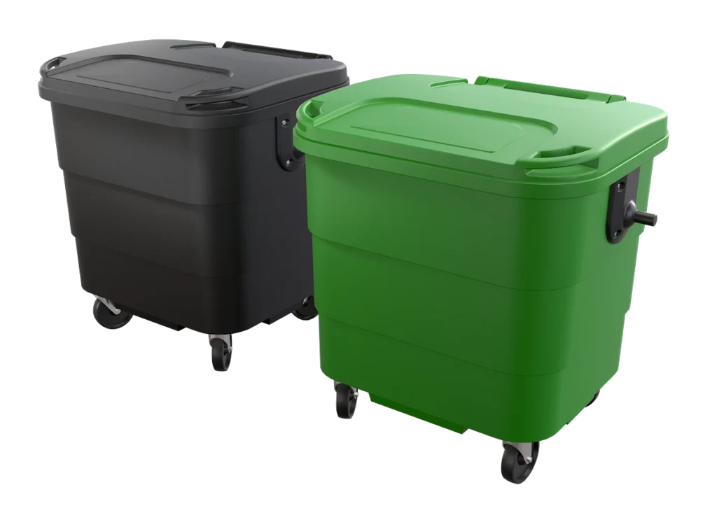 El contenedor urbano de 1100 litros es resistente, no requiere pintado, está adaptado al usuario y se ofrece con tapa opcional para residuos peatonales.